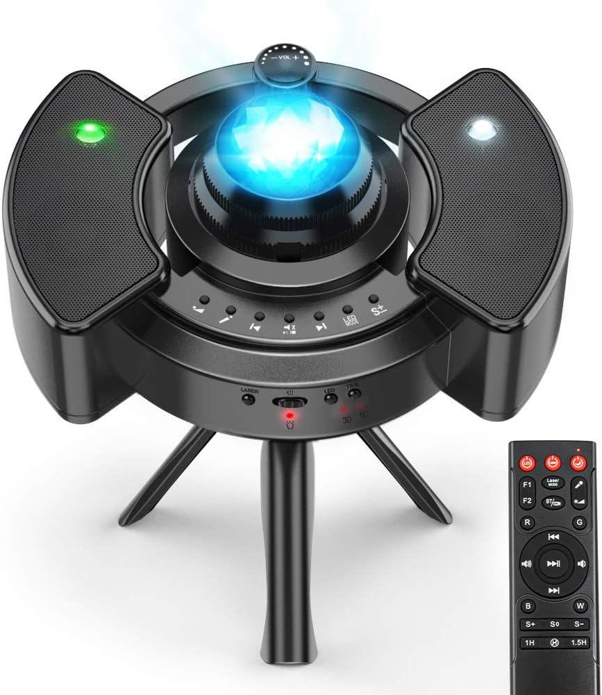 - [Multifunción de Control Remoto]: Viene con multi-función de control remoto. Puede utilizarlo para cambiar el modo de proyección de luz y reproducir pistas en cualquier momento, también puede controlar el volumen y la velocidad de la velocidad de rotación de la luz. Es muy conveniente para su uso. Sólo necesita un mando a distancia, usted puede jugar todas las funciones.